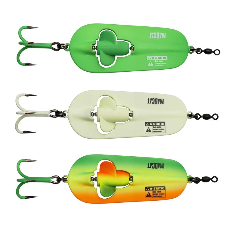 Une machine à turbulences, voilà comment on pourrait caractériser cette cuillère Madcat. La Madcat A-Static Rattlin’ Spoon dispose en effet d’une hélice qui, lors de l’animation, tournera en émettant des turbulences très fortes. Cette hélice renferme en plus des billes bruiteuses qui s’entrechoqueront lors de la récupération et qui se montreront redoutables pour stimuler l’agressivité des silures postés sur la zone.