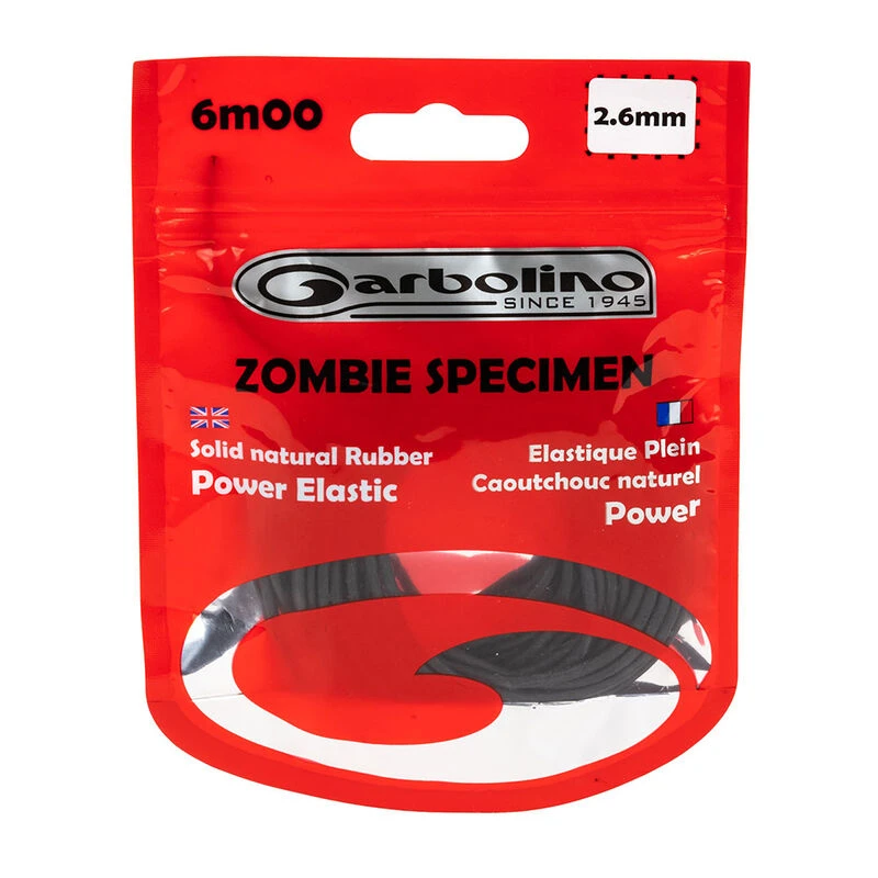Elastique plein Garbolino de gros diamètre pour la pêche des carpes, des esturgeons et des silures. Les élastiques Zombie Spécimen sont réalisés en gomme Power afin de contrer les rushs des poissons les plus combatifs.
